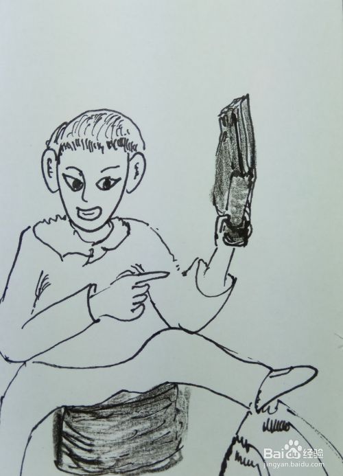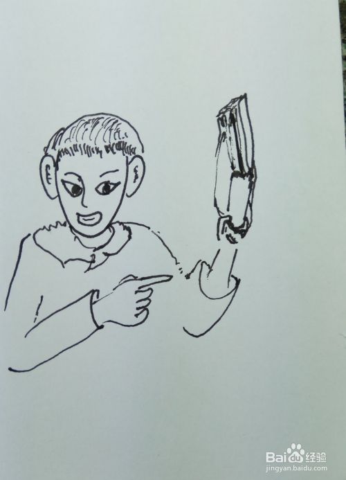 用线条和曲线画出他左边的胳膊,画出他左手里拿着的物品。