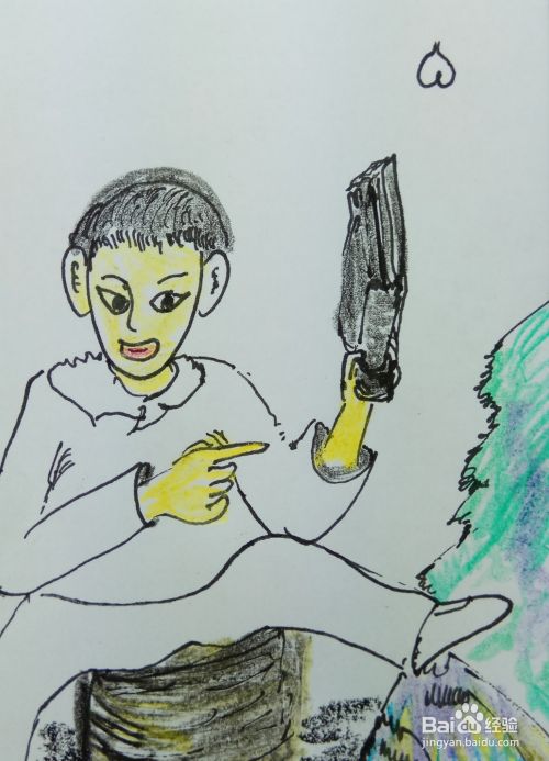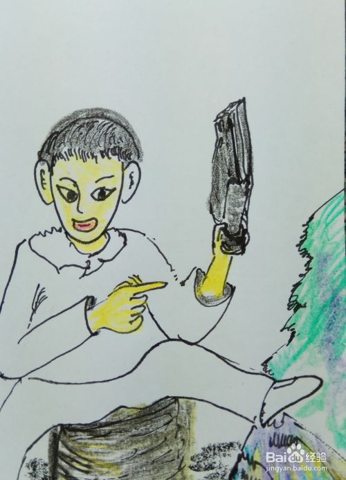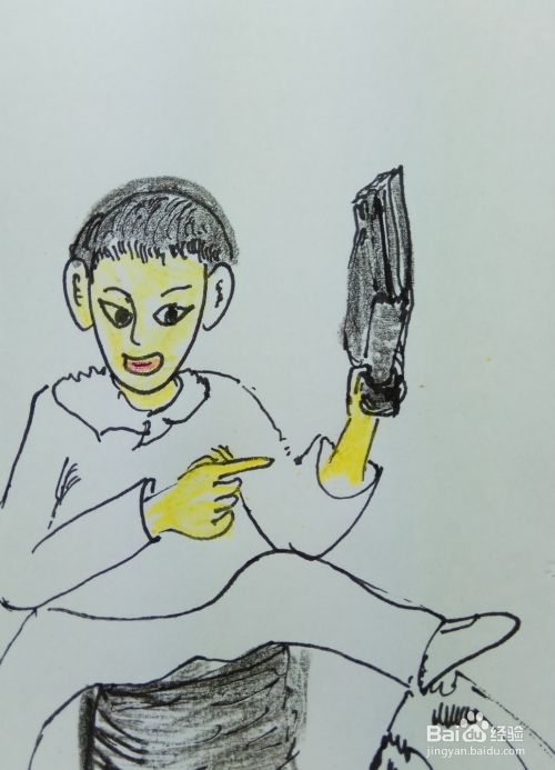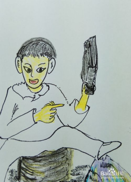 用浅黄色的水彩笔涂头发的皮肤色彩,然后再画出他屁股下面坐着的石头。