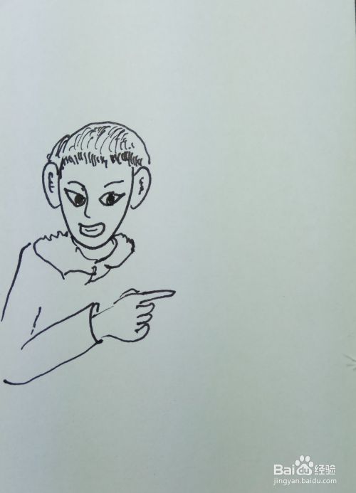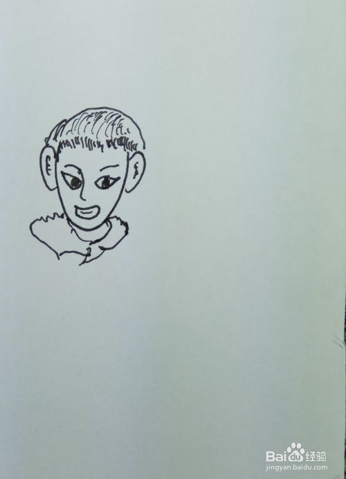 在白纸上用线条和曲线画出一个小男孩的头部轮廓,并画出他的五官,头发和衣服领子。