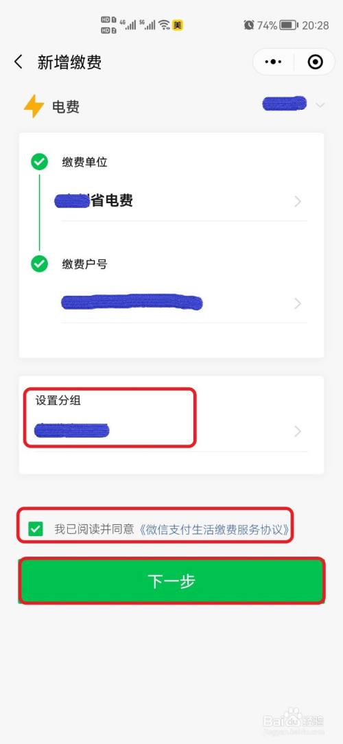 选择需要缴费的城市和缴费单位,输入缴费户号并确认,对缴费进行设置分组,阅读微信生活缴费服务协议并勾选,点击“下一步”。