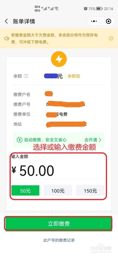 进入缴费户号的账单详情,然后在输入金额处输入需要缴费的金额,或在下方选择50,100,150中的金额,点击“立即缴费”,即可完成电费缴纳。
