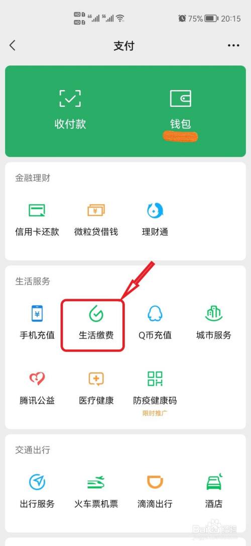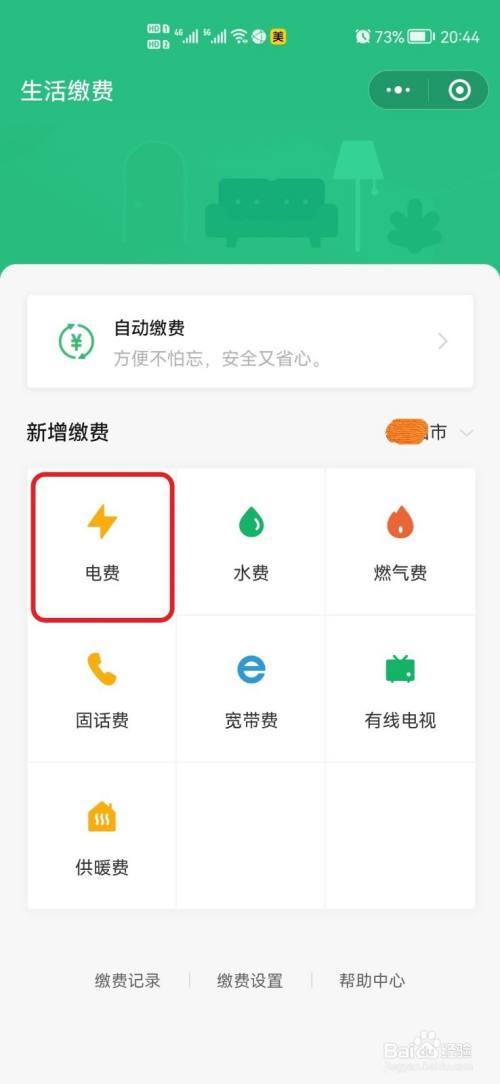 在支付界面中生活服务栏选择“生活缴费”,在新增缴费内容中选择“电费”。