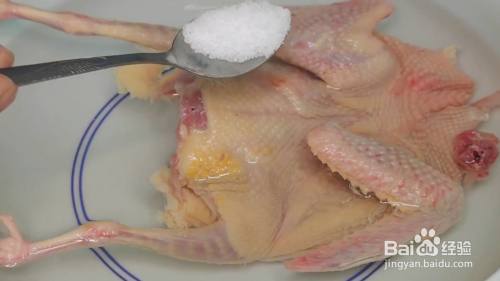 将处理好的鸽子放入清水中,往里面加入一勺食盐,加入姜片搅匀,浸泡去腥。