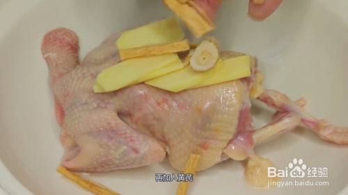 准备一个砂锅,将浸泡好的鸽子放入,加入姜片,再加入黄芪,党参,注入矿泉水或过滤水,与鸽子齐平。