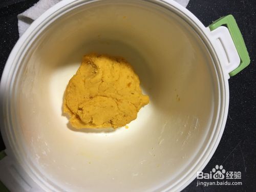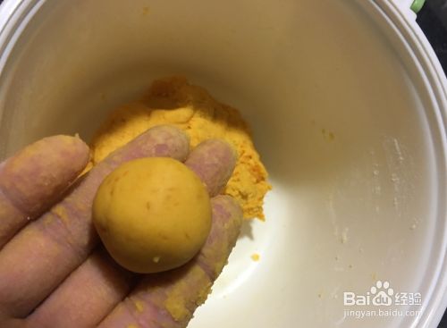 拿起一小块南瓜泥,重量4克左右,放在手上慢慢搓圆,搓圆后在手上摔打几个回合,使丸子更加结实。