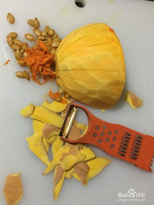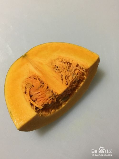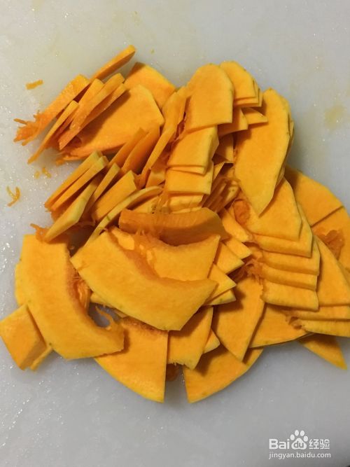 南瓜选取表面带有绿纹的老南瓜为最佳,用削皮器把南瓜去皮,去掉瓜籽和瓜囊,冲洗干净后沥干水分,切成薄片。