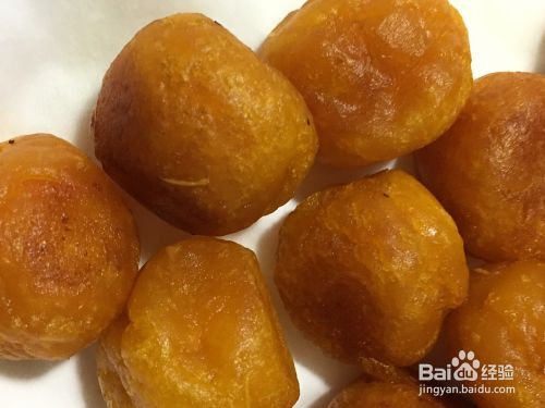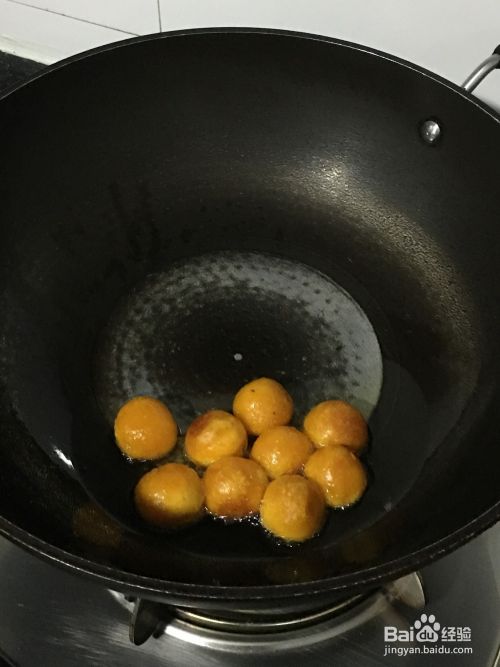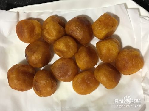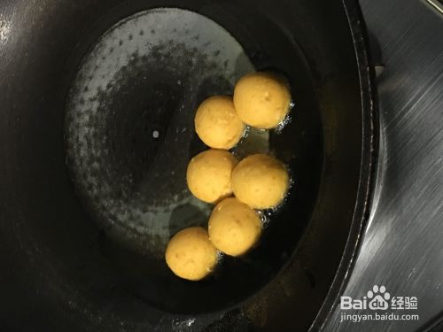 起锅热调和油,油要多倒一些,待油开始拉丝时,煤气转小火,把南瓜丸子轻轻放入锅中,炸至金黄色。