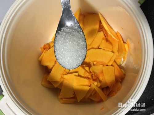 把切好的南瓜薄片放入微波炉专用盒,加入三勺白糖,放进微波炉高火5分钟。(每台微波炉功率不一样,要视自家情况而定)也可以放入蒸锅中蒸熟。