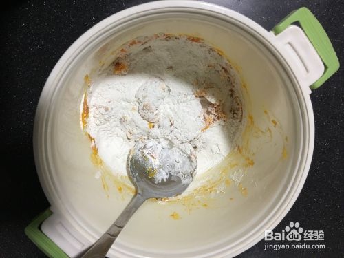 用大勺子把蒸熟的南瓜压成泥,把称好的面粉倒入容器中搅拌均匀,也可以用手抓均匀,不要加水,南瓜自身水分非常多,足够了。