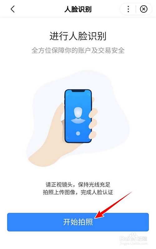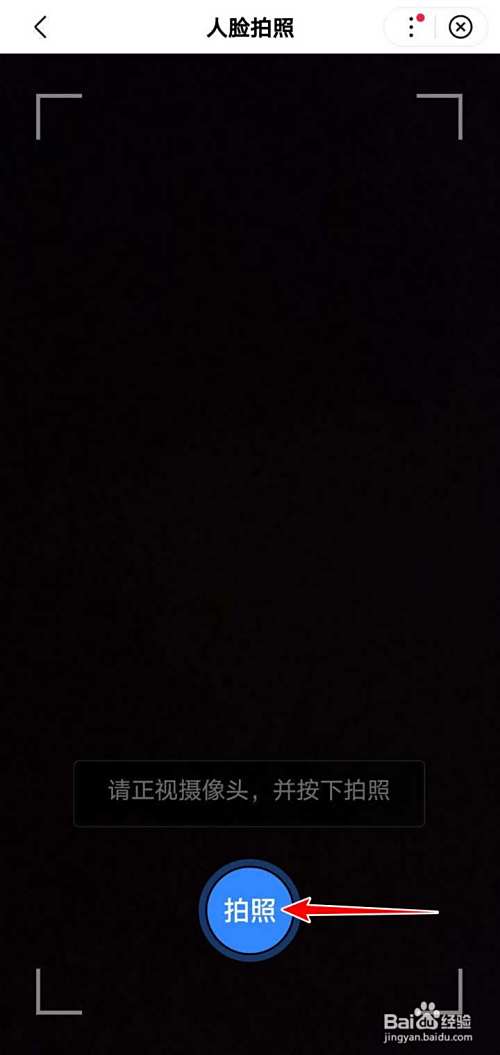 在人脸识别页面,按页面提示点选开始拍照,正视摄像头,持稳相机,点选拍照;
