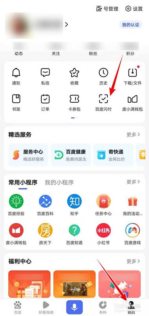 在百度APP,点选右下角我的,进入我的页面,包含常用的功能和服务,点选百度闪付;