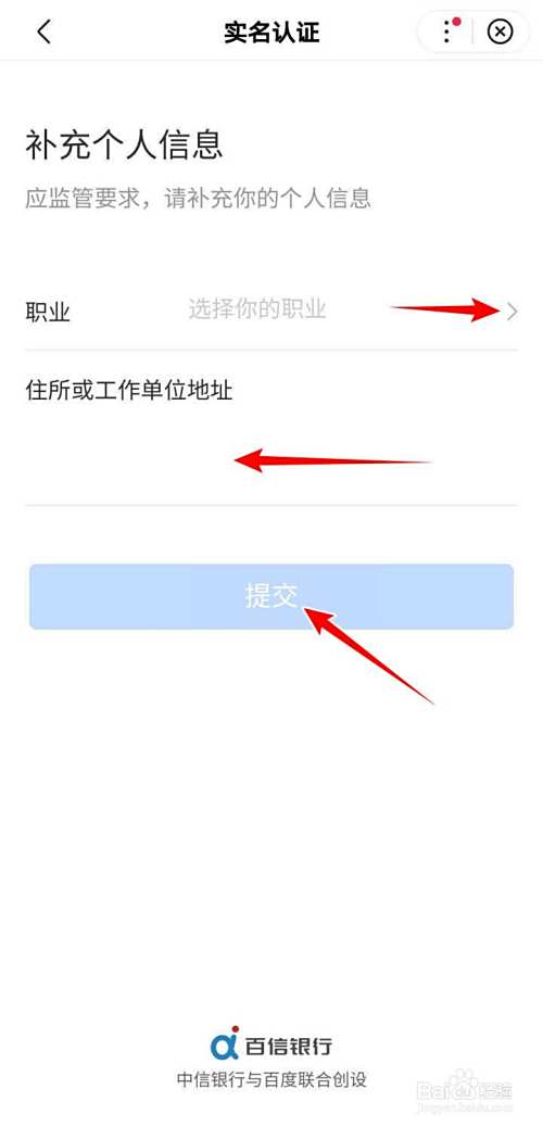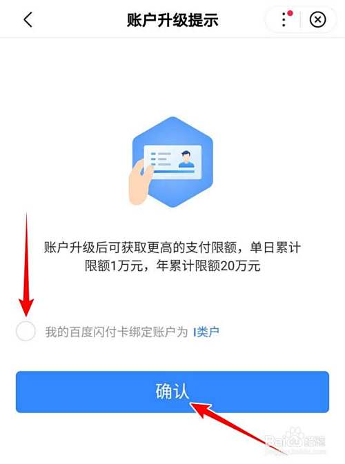 在实名认证界面,补充个人信息,选择职业,输入地址,确认无误后,点选提交,在账户升级提示页面,勾选“我的百度闪付卡绑定账户为I类卡”,点选确认即可;