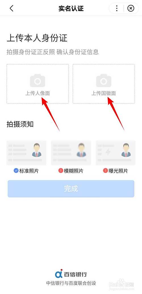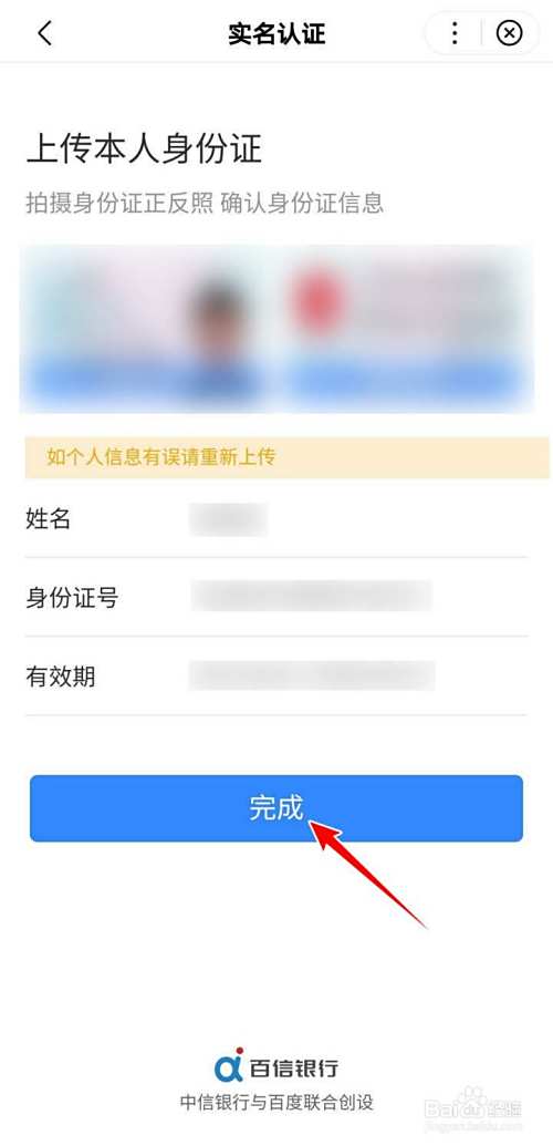 在实名认证界面,点选上传本人身份证正反面,上传完成后,查看一下识别后的个人信息,确认无误后,点选完成;