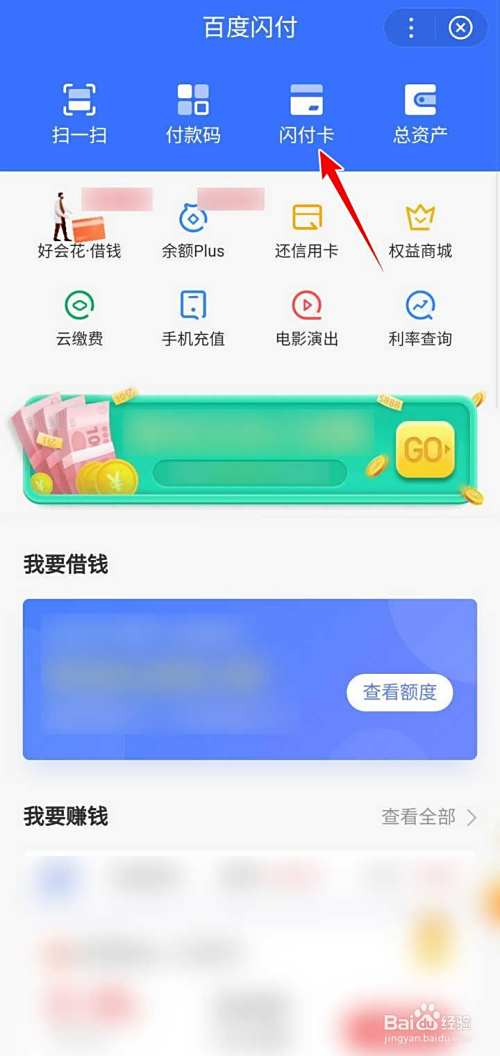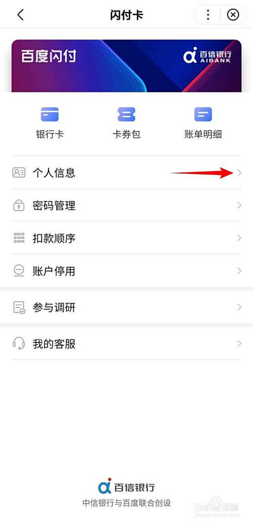 在百度闪付的页面,页面有一些功能入口和宣传内容,在闪付卡页面,点选个人信息右侧的箭头;;
