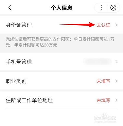 在个人信息页面,点选身份证管理右侧的去认证;