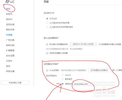 在UC浏览器打开下拉菜单后,找到“设置”这个按钮,点击打开,在“常规”里面有一个“浏览器主页保护”找到这个,你不管它当时是怎么设置的,你现在就去掉“UC主页保护”前面框里的勾选,当你看到屏幕显示“以保存设置”你再把“UC主页保护"框里的钩选上,下面主页锁定改成“使用此页”在后面的框里写上你要改成的网址。