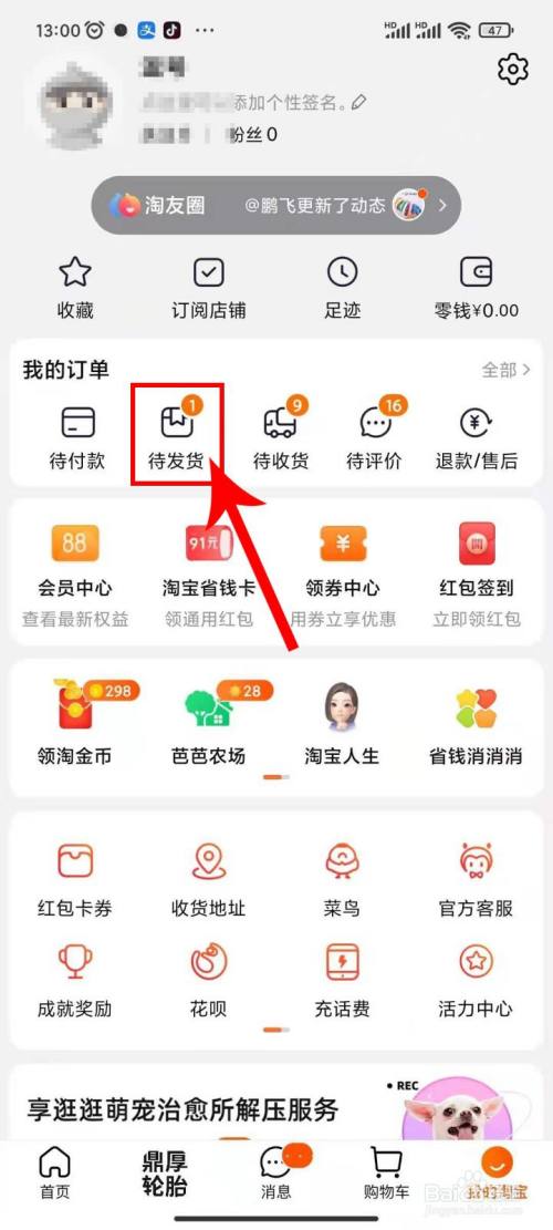 从我的淘宝页面找到我的订单,点击“待发货”按钮。【下方如图所示】