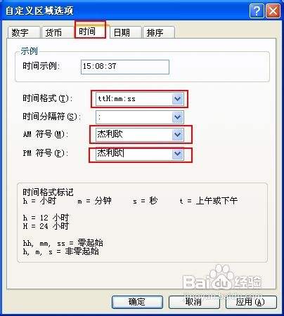 “选项”-----“自定义”----“时间”----时间格式(T)里的H:mm:ss前加两个tt,ttH:mm:ss ,如果你想让你喜欢的名字在时间的后面显示 ,你可以把tt打在后面,H:mm:sstt。然后在AM符号(M):里填上你喜欢的名字,在PM符号(P):里也填上你喜欢的名字。