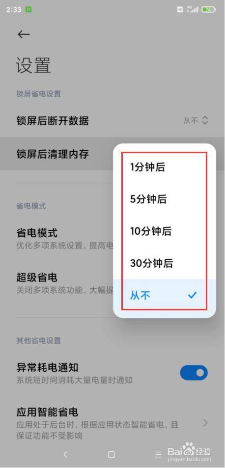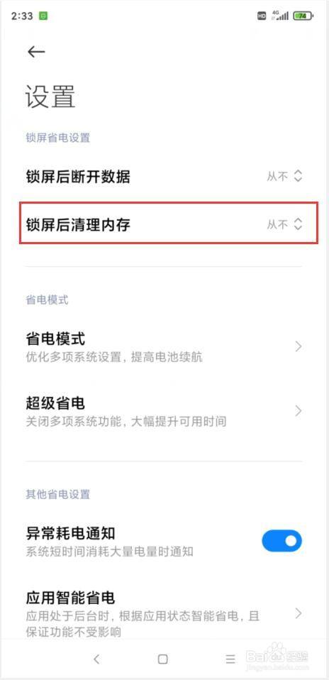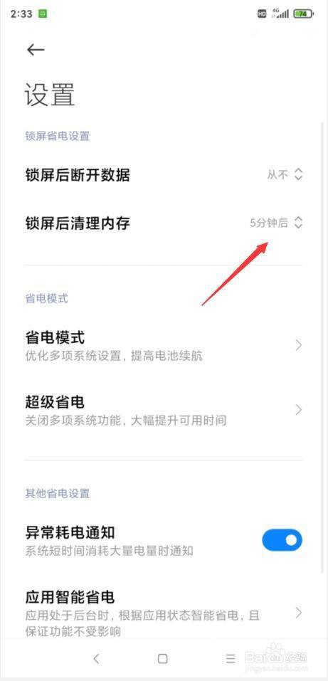 在锁屏省电设置中,点击锁屏后清理内存选项