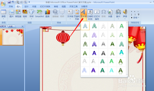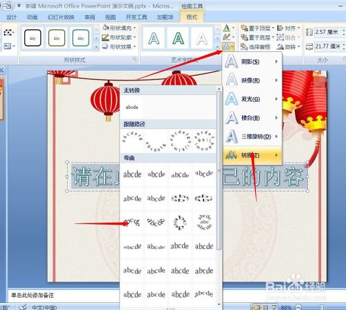 插入艺术字,选择自己喜欢的字体形,调整字体效果,根据自己的喜好可以随意调整字体的颜色和显示效果。