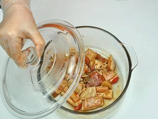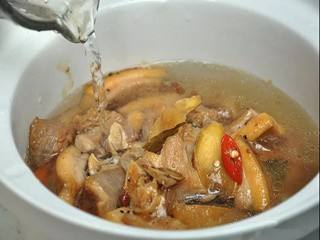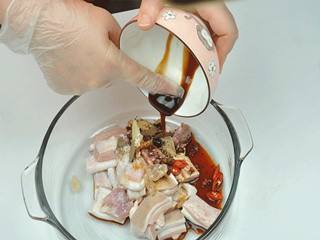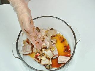 牛腩清洗干净,切成小块,加入生姜、香叶、小米椒、冰糖、花椒、生抽、蚝油、黑胡椒和食盐。