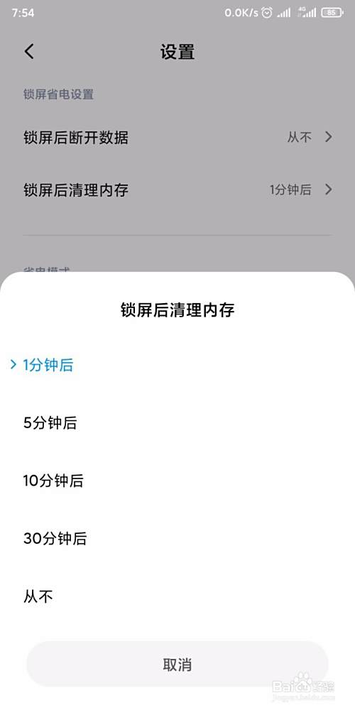 然后在列表当中我们可以根据自己的需要来选择时间,一般情况下选择一分钟就可以了,这样就可以自动来清理手机的内存了,下次我们在使用的时候就非常的顺滑。
