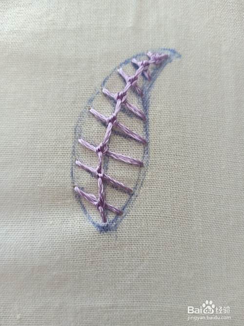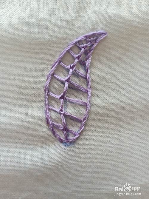 绣完最后一针结粒珍珠绣,直接把针从末端入针就可以了。然后用“轮廓绣”绣出外面的边,一片花瓣就绣好了。