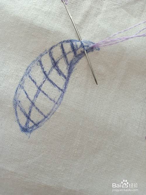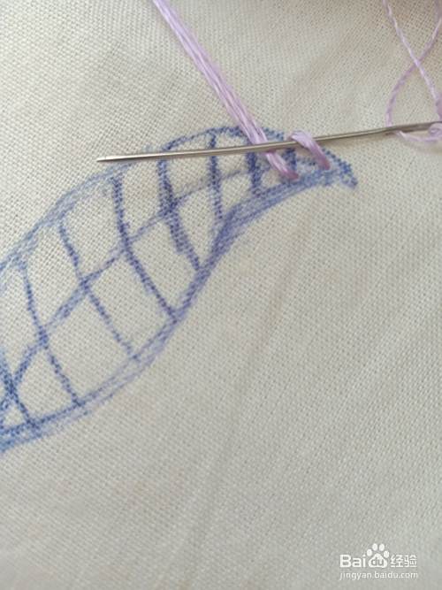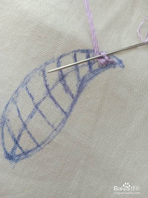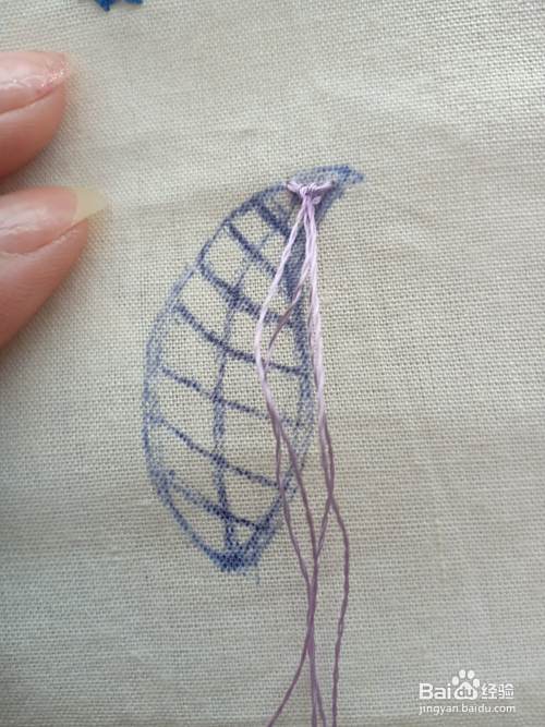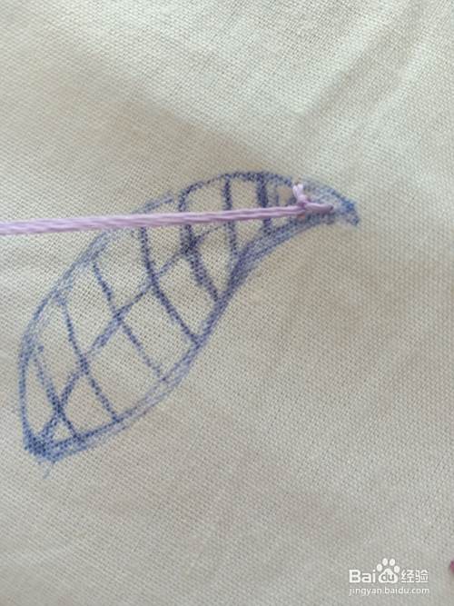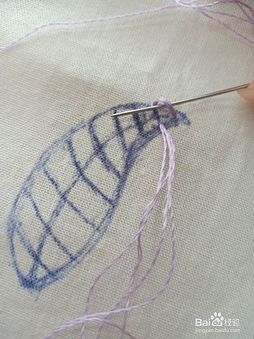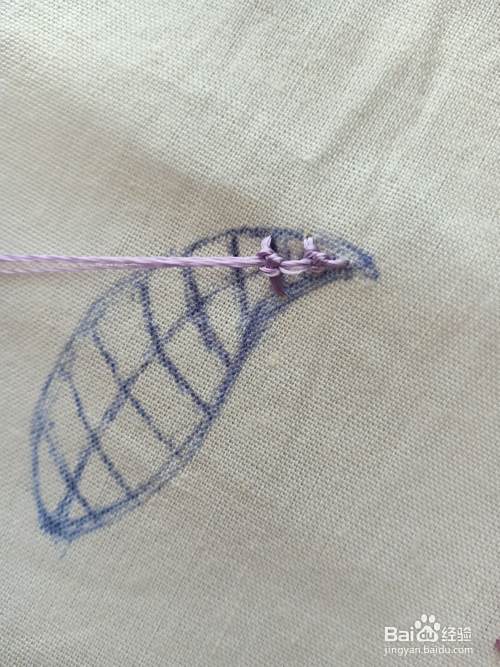 将针从花瓣的“尖头中间辅助线”上的位置 出针。再在第一条横线“上下”出入针。