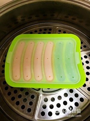 将虾泥到倒入香肠模具中,倒入之前用核桃油把模具里面刷一层油,方便脱模。