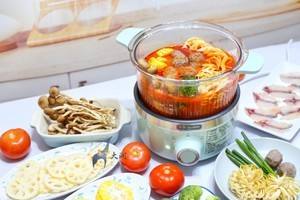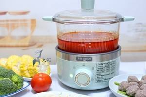 火锅汤底煮开就可以开刷了,把你想吃的都放进火锅里,煮开就可以了,食材煮熟后可以拧到慢炖功能键,慢慢煮。