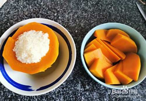 装糯米的南瓜只去皮,不切开,装入糯米