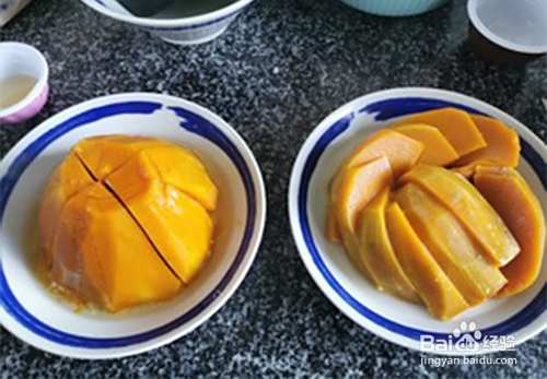 倒扣在盘子中,装糯米的南瓜用刀划开淋上蜂蜜,没有糯米南瓜,50克水加3克淀粉搅拌均匀,淋再上面