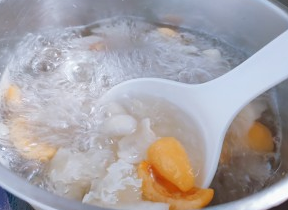 把银耳、百合和冰糖倒入小锅中,加适量水,中火煮约30分钟,让银耳微微起胶的状态。