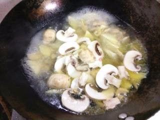 然后下入蘑菇,煮开,小火继续煮3分钟。