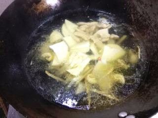 倒入开水,同时下入冬笋片,大火煮开转小火煮1分钟。