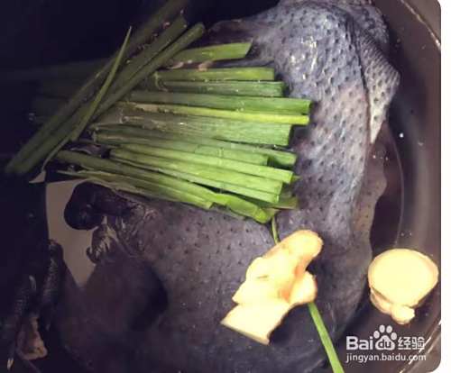 接下来就是乌鸡要焯水,加点姜片,加点料酒去腥,去血污,便可捞起