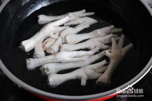 鸡爪下锅焯水十分钟,里面加入适量的姜片,料酒用来去腥增香,时间到了捞出过一遍凉水。洗干净表面的杂质
