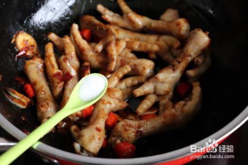 调料炒香之后加入准备好的鸡脚下锅,翻几下,加入老抽适量上色,生抽酱油一勺调味,盐适量调整咸淡,把鸡爪和调料翻炒均匀。