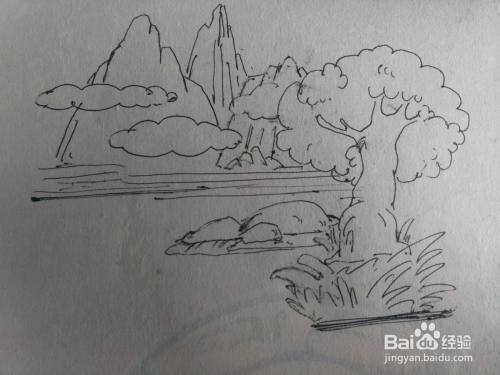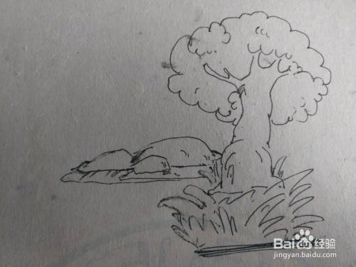 第四步画出大树后面的石头的形状。