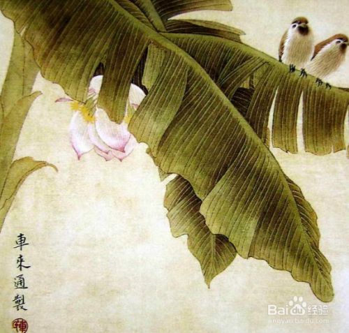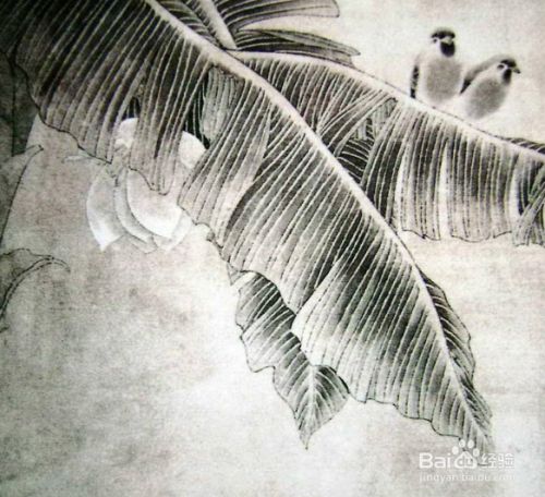 白描勾线,淡墨勾花, 重墨勾芭蕉叶子及干。
