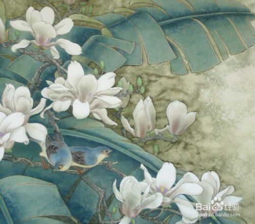 花冠平涂白粉,淡墨分染叶子(留水线),反叶用墨绿色分染。