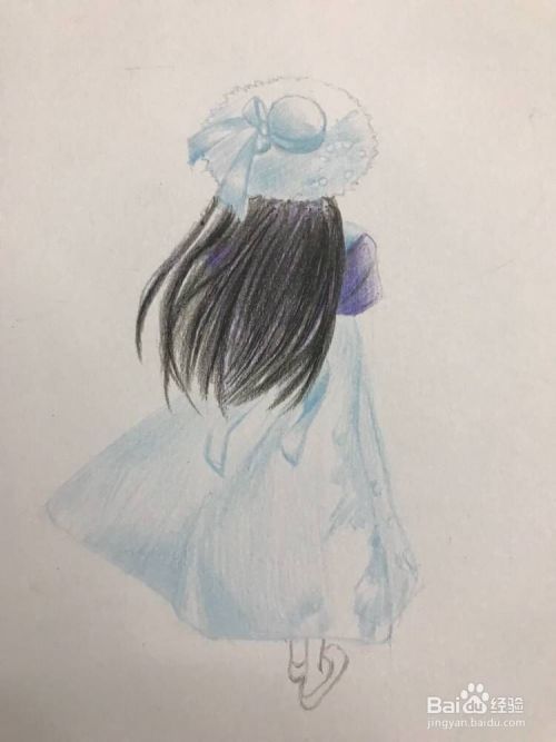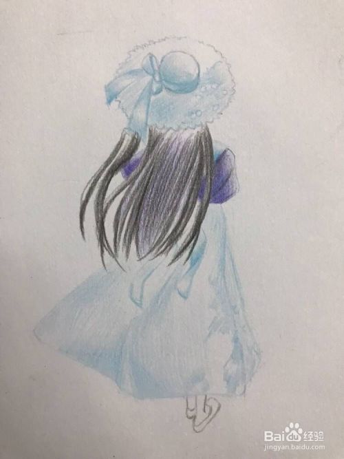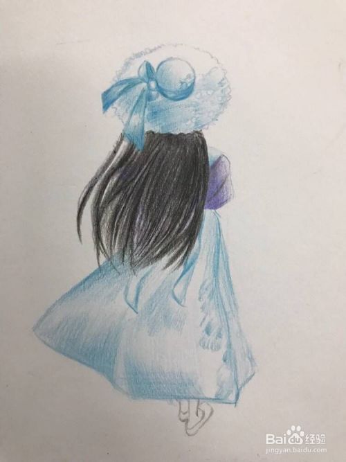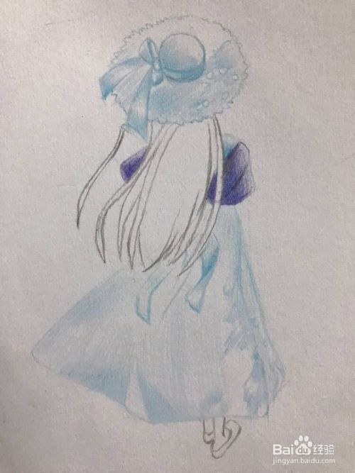 用彩铅淡蓝色平铺下帽子的下半部分,裙子的下摆部分,注意裙摆中间段留白,相关的蝴蝶结浅浅得铺一下底色。