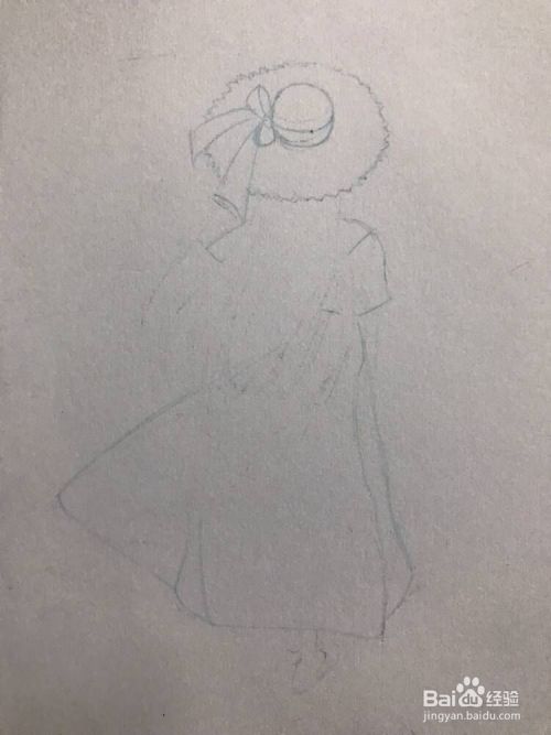 用铅笔先画出少女的背景:帽子、头发、裙子等