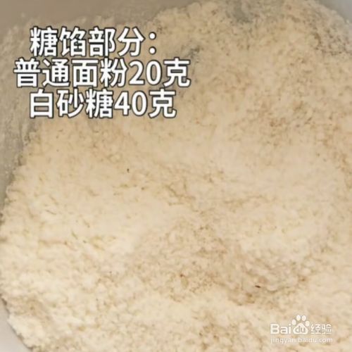糖馅部分:面粉20克,白砂糖40克。混合均匀,备用。