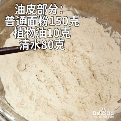 油皮部分:面粉150克,植物油10克,清水80克。混合均匀,和成光滑的面团。包上保鲜膜备用。