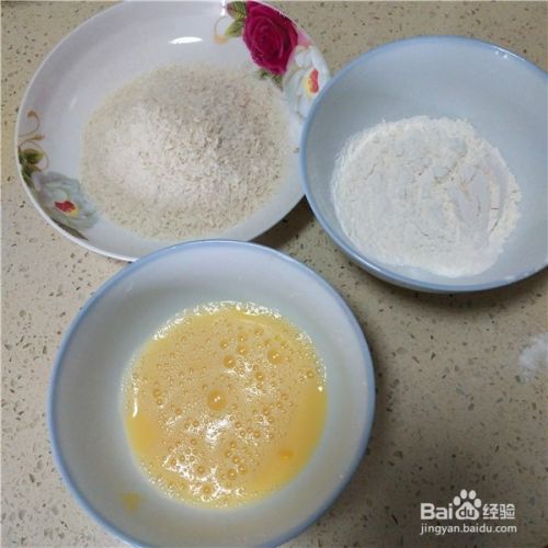 依次准备好干面粉、鸡蛋液和面包糠,分别放在小碗和碟子中。