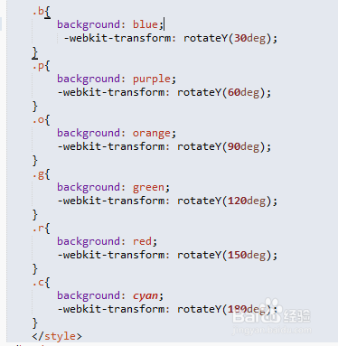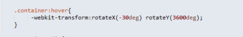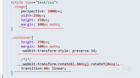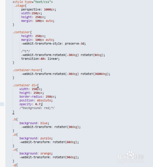 我们先控制 舞台 和容器 的样式,和设置一些关键属性,perspective 这个设置视距;-webkit-transform-style:preserve-3d;设置为3D(差不多这个意思),然后下面的-webkit-transform:rotateX(-30deg) rotateY(0deg);旋转一下容器让效果更好一点;