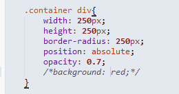 然后我们设置一下 小div 的样式和透明度,通过 border-radius这个属性将div变为圆形,初步的效果如图二;(因为设置看定位,所以div都重合了)