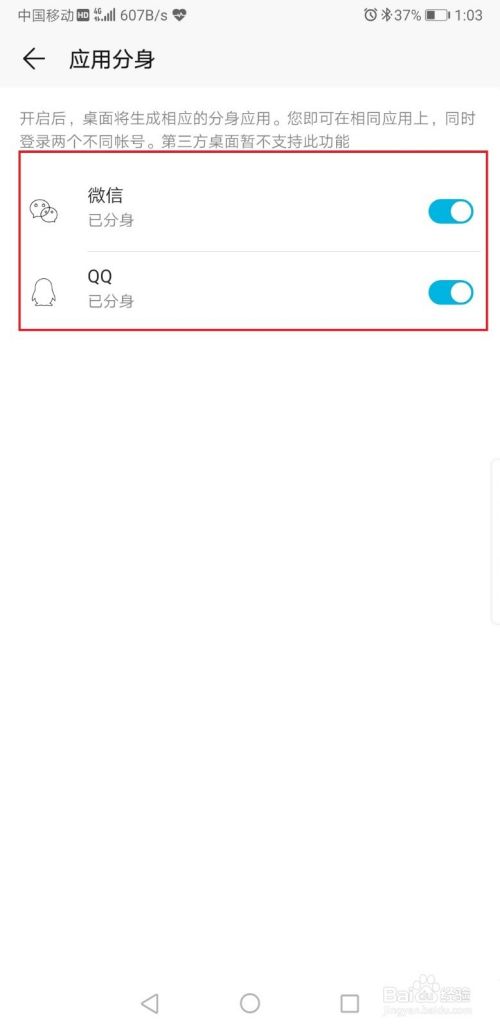 在【应用分身】我们可以看到这里有两个可以应用是可以开启的,【微信】和【QQ】