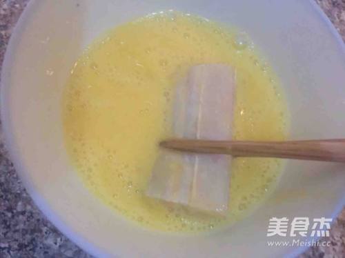 3鸡蛋充分打散,将腌制好的带鱼段均匀的裹满蛋液